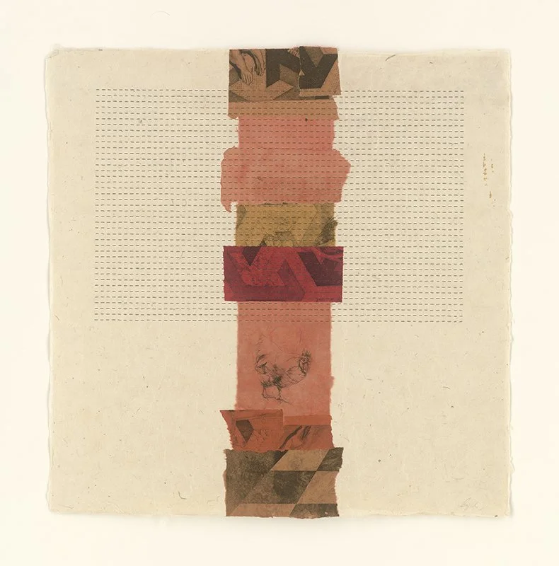 Ingrid Restemayer, Pillar, 26x26, etching, French knots on handmade paper